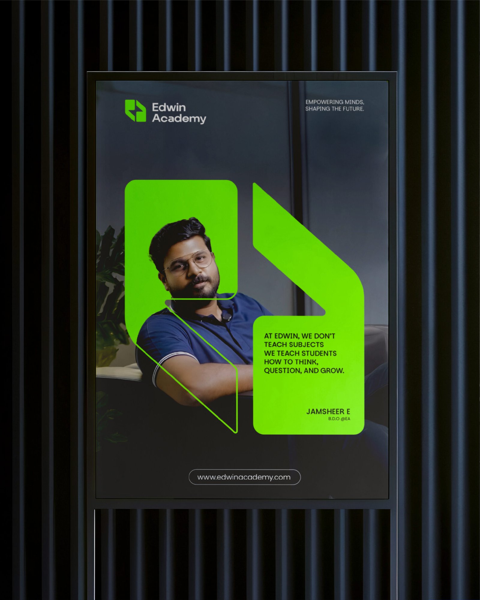 Every campus — Kannur, Calicut, and Cochin — now carried the same consistent visual identity, ensuring a unified presence across the brand. Whether students walked into the flagship Cochin campus or the original Kannur location, they experienced the same bold, professional Edwin Academy.